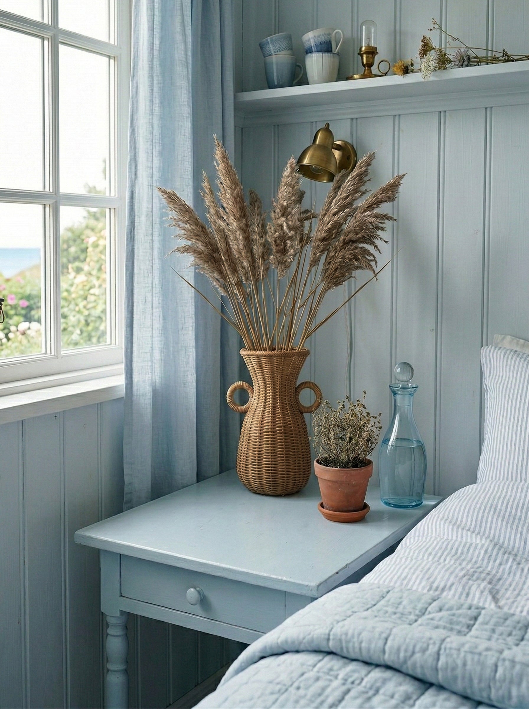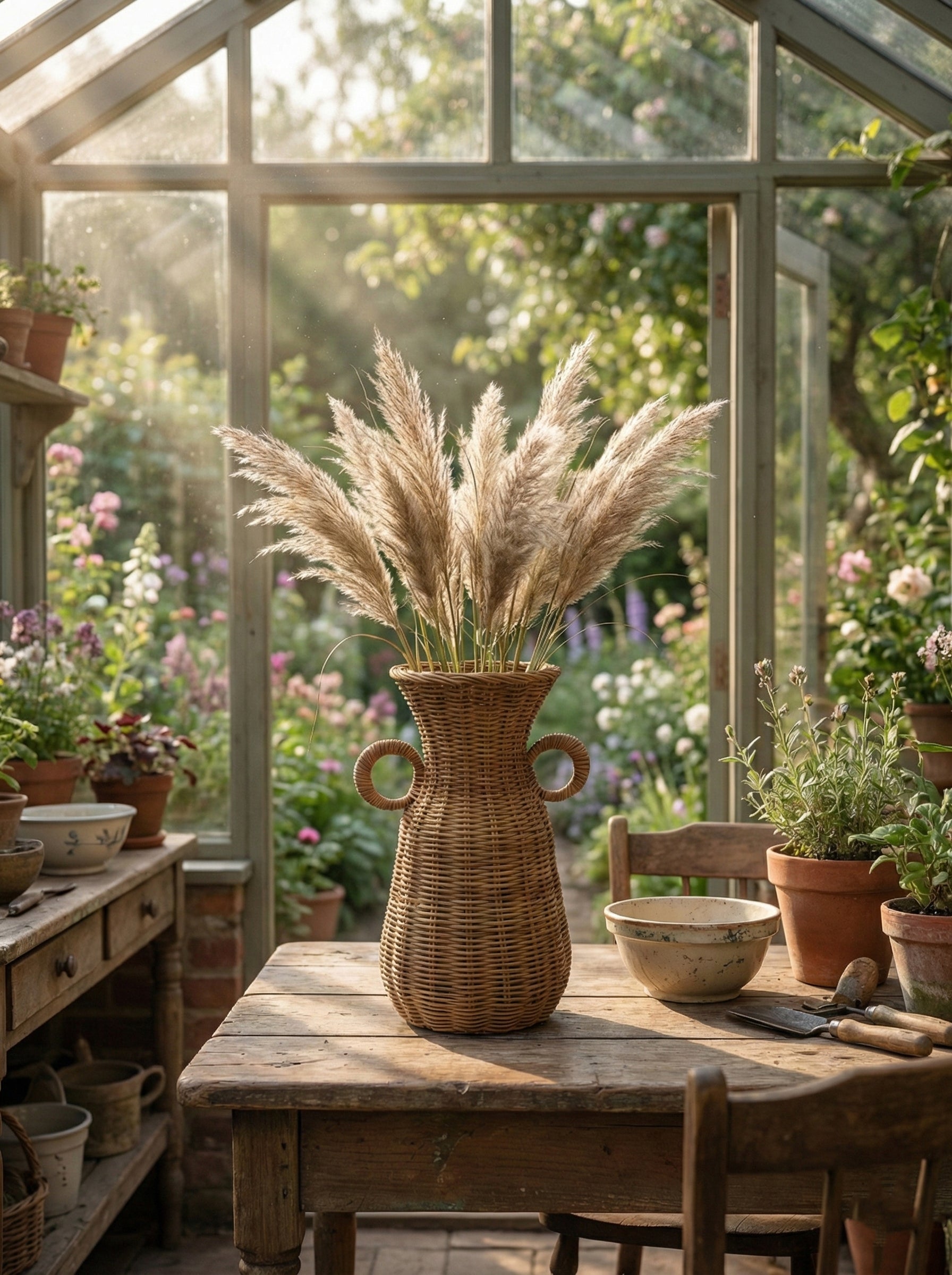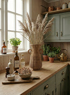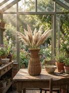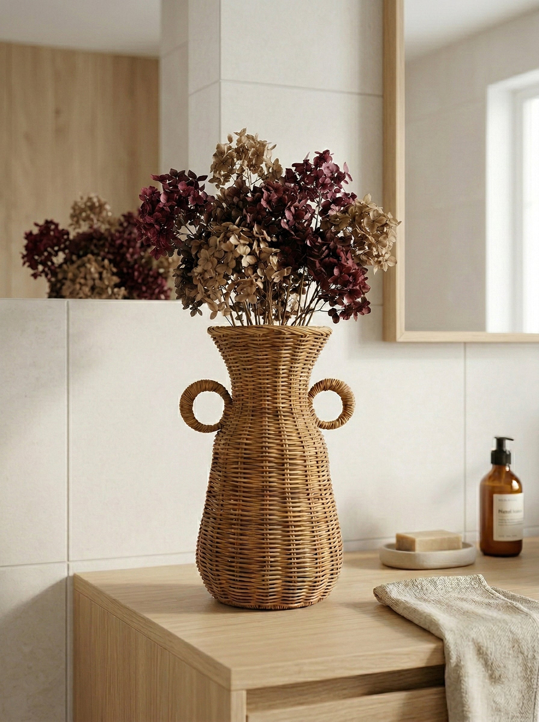 The vase is a beautiful and decorative addition to any interior. Made from natural rattan, it features a unique boho-inspired design. The playful, round handles give the vase a stylish touch that immediately draws attention. Use it as a standalone decoration, fill it with dried flowers for a special look, or place a glass of water inside to display fresh flowers. The vase is perfect for the living room, hallway, or bedroom. It measures 36 cm in height, with a top diameter of 17 cm, a diameter of 21 cm at the handles, and 17 cm at the base.